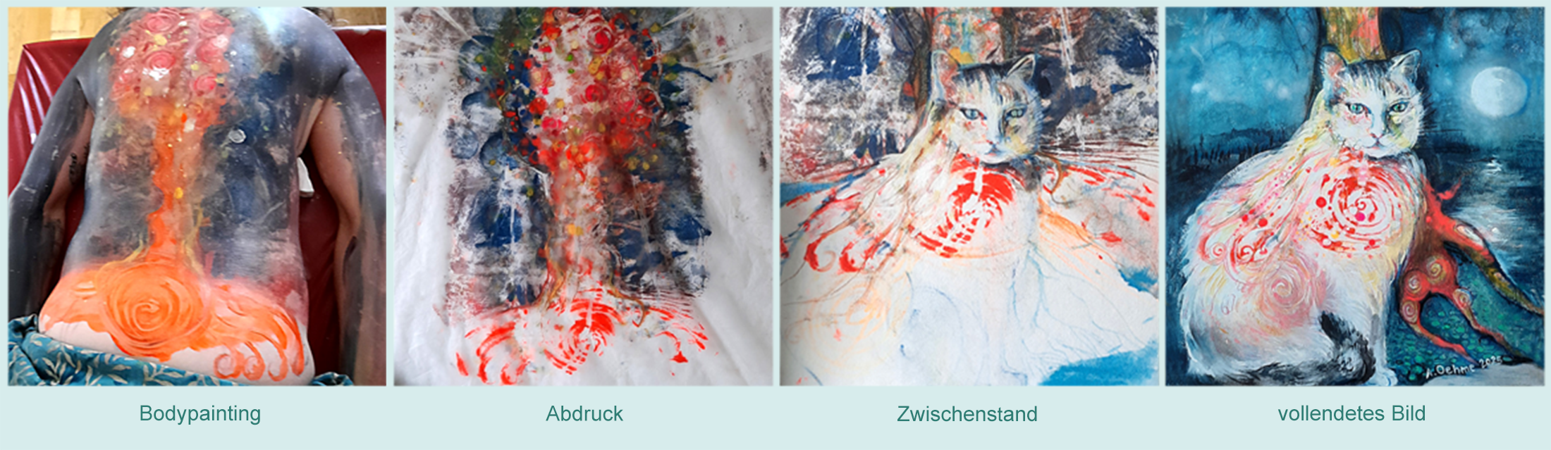 Ich wurde angefragt in dem Dokuformat, „Seitenwechsel, die Welt mit anderen Augen sehen“, in der Folge „Körperkunst“, mitzuwirken. Der Dreh fand im Oktober 2024 statt. (Ausstrahlungstermin: 14.07. 2025 auf RTL, dann Mediathek RTL+) Alle Schritte eines Massage-Paintings wurden gefilmt. Das Vorgespräch, die Massage, die Körpermalerei und auch die Entstehung des Abdrucks. Dieser hatte durchaus Potenzial vollendet zu werden. Zu Beginn habe ich den Bezug zu einer konkreten Auftraggeberin, wie sonst gegeben, vermisst. Aber meine Katze war mir behilflich, indem sie im wahrsten Sinne des Wortes die Rolle/den Raum eingenommen hat. Nachts sind alle Katzen grau? Auch meine weiße? Nicht wenn der Mond scheint. Dann leuchtet sie und leistet dem Traumzauberbaum Gesellschaft.
