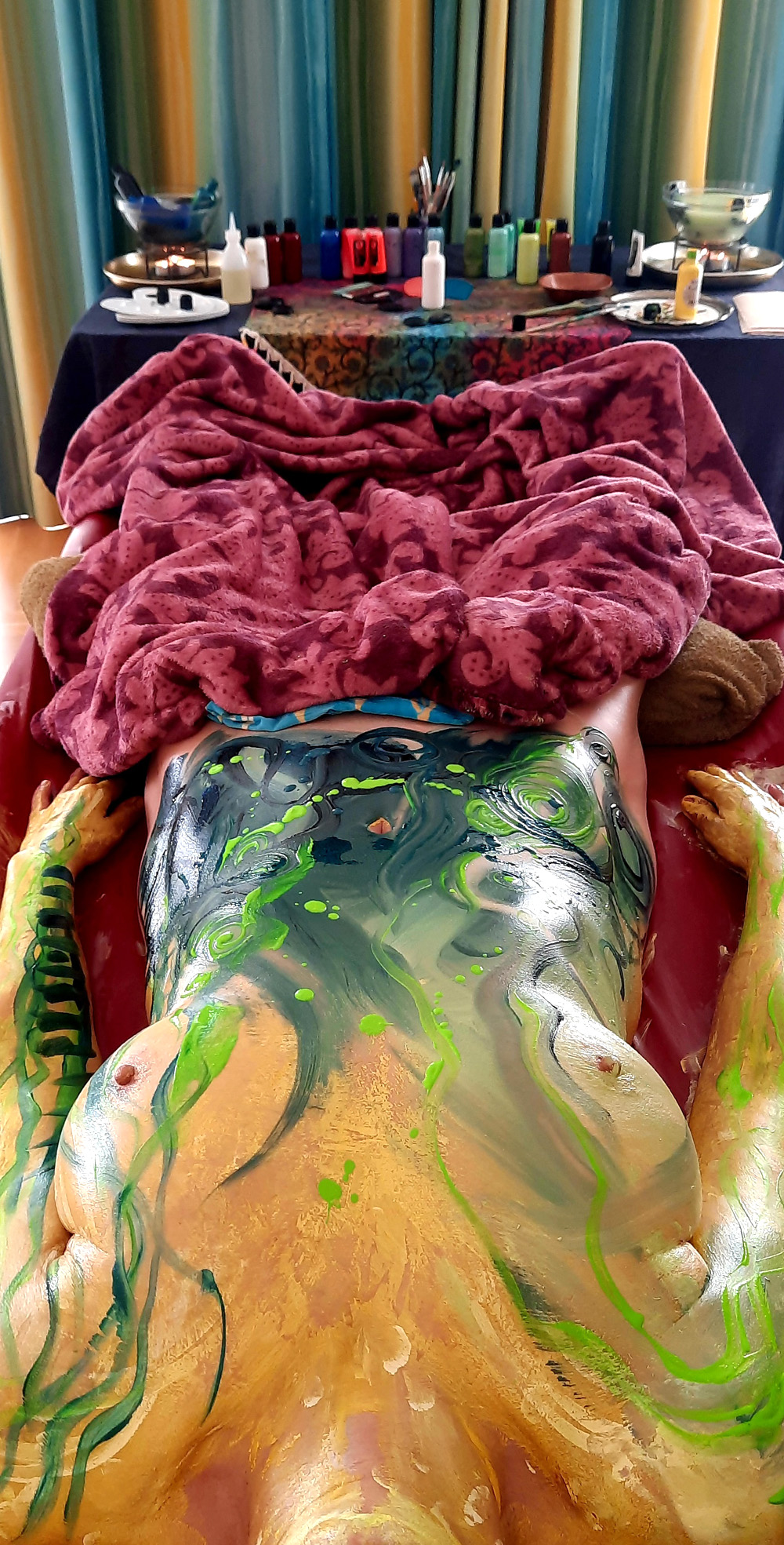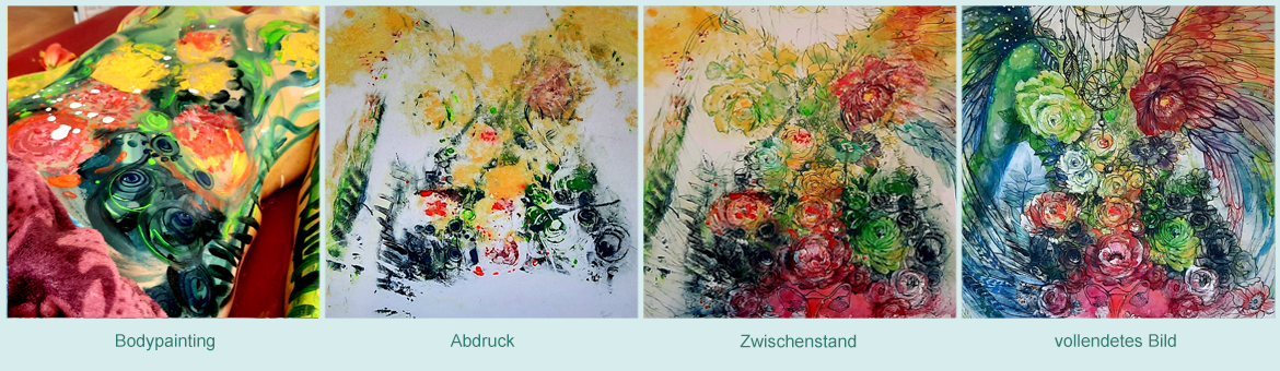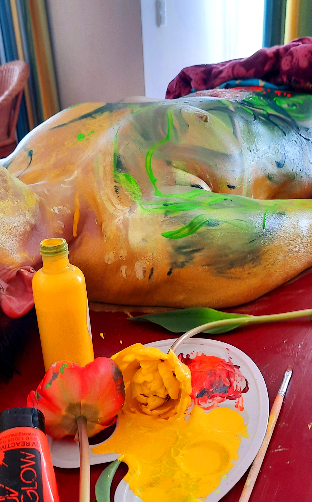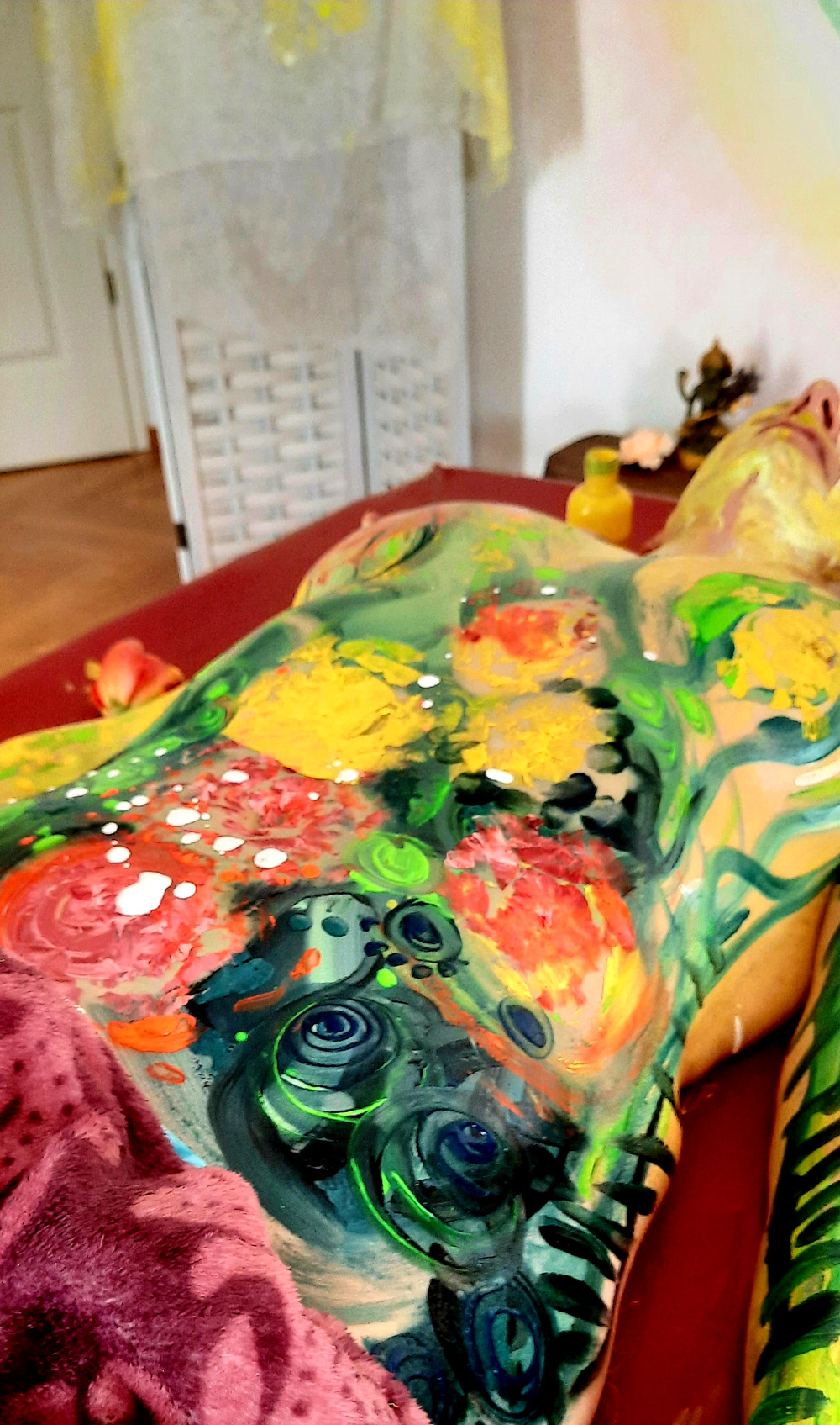 In ihrer Symmetrie und Aufrichtung sind bisher von Körpervorderseiten immer hochformatige Bilder entstanden. In diesem Falle hier war die Vorderseite aber als Querformat gewünscht. Da wir als Themen Abgrenzung und Schutz in das Massage-Painting mit hineinnahmen, kam mir zu Beginn der Session ein Geistesblitz zu Hilfe. Ich ließ die Kundin mit der ersten Farbschicht (gelb) die Arme ausbreiten. Ich nahm bereits davon schon einen Abdruck und setzte die Körpermalerei wie gewohnt fort. Den gleichen Vliesstoff nutze ich am Schluss noch einmal. Und schon war es quer, das Format. Ausreichend Platz für schutzgebende Flügel war entstanden. Während einer intensiven Festival-Yogastunde gab es eine Inspiration vom Lehrer zu unseren Flügeln. Die rechte Seite kann als unser „menschlicher Flügel“ angesehen werden. Die linke Seite als „göttlicher Flügel“. Wie toll, dass in diesem Bild hier tatsächlich auch der rechte Arm sichtbar geworden ist. Schutz und Abgrenzung. Zum einen liegt es schon bei uns verantwortungsvoll damit umzugehen. Aber wir sind durchaus auch unterstützt von unsichtbaren Kräften. Kannst Du das auch bestätigen?