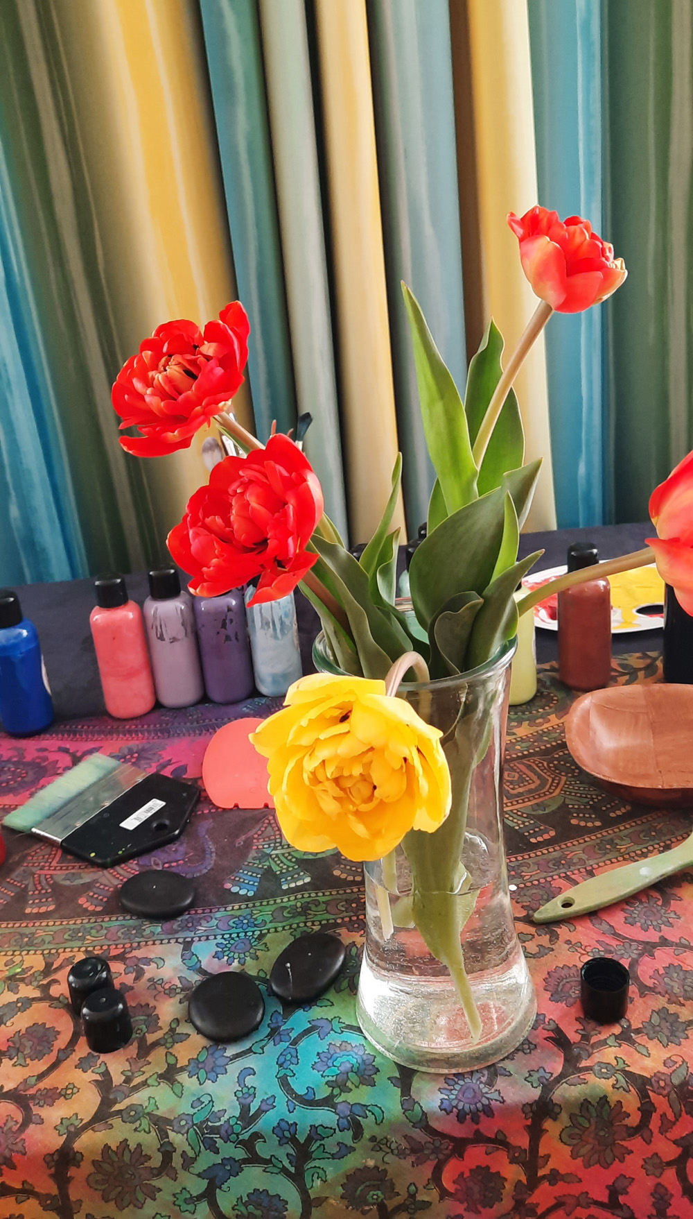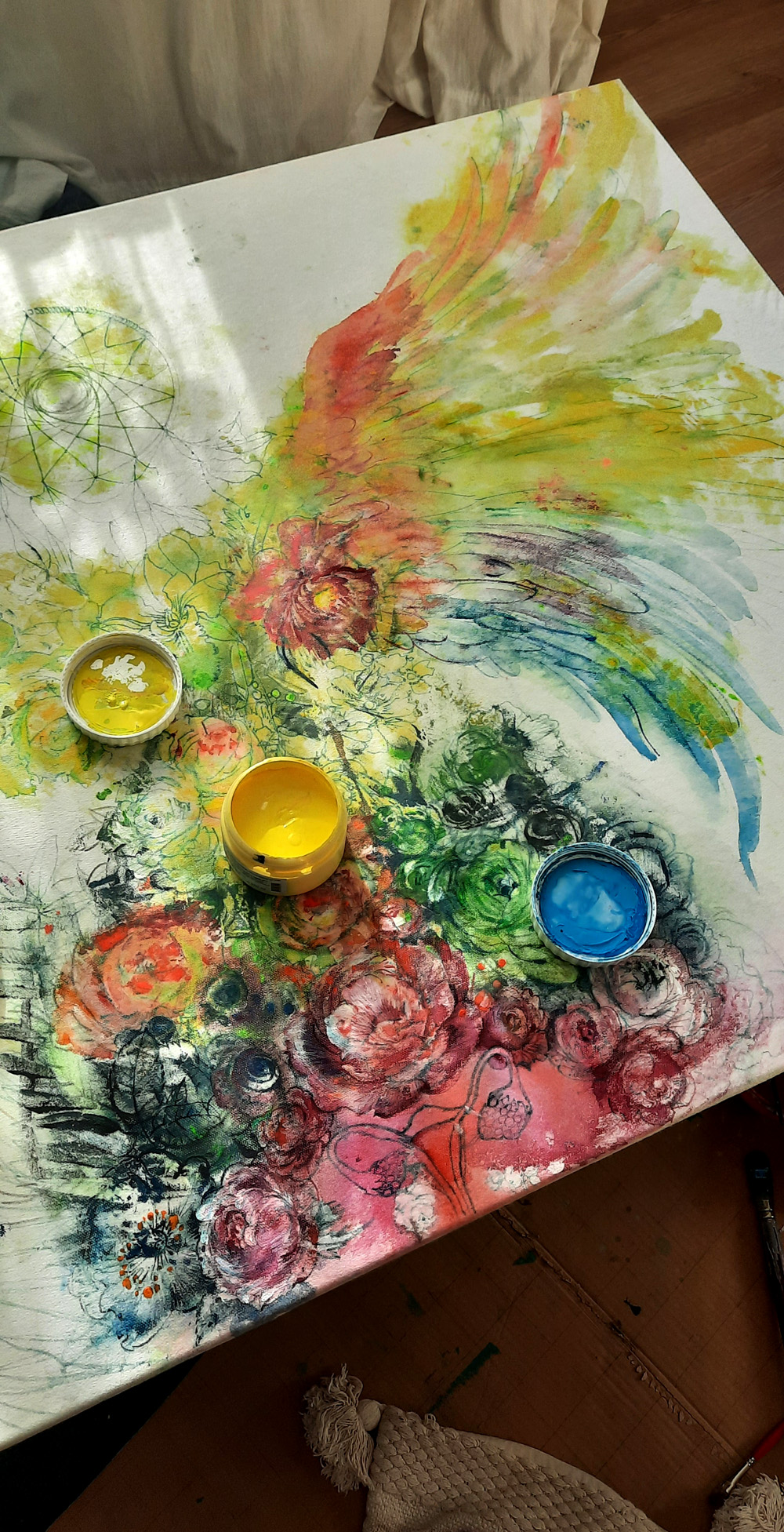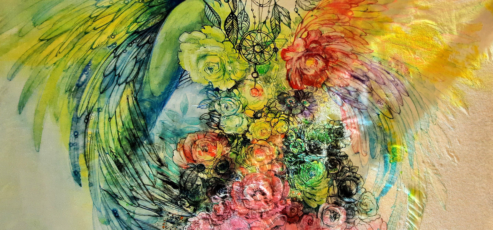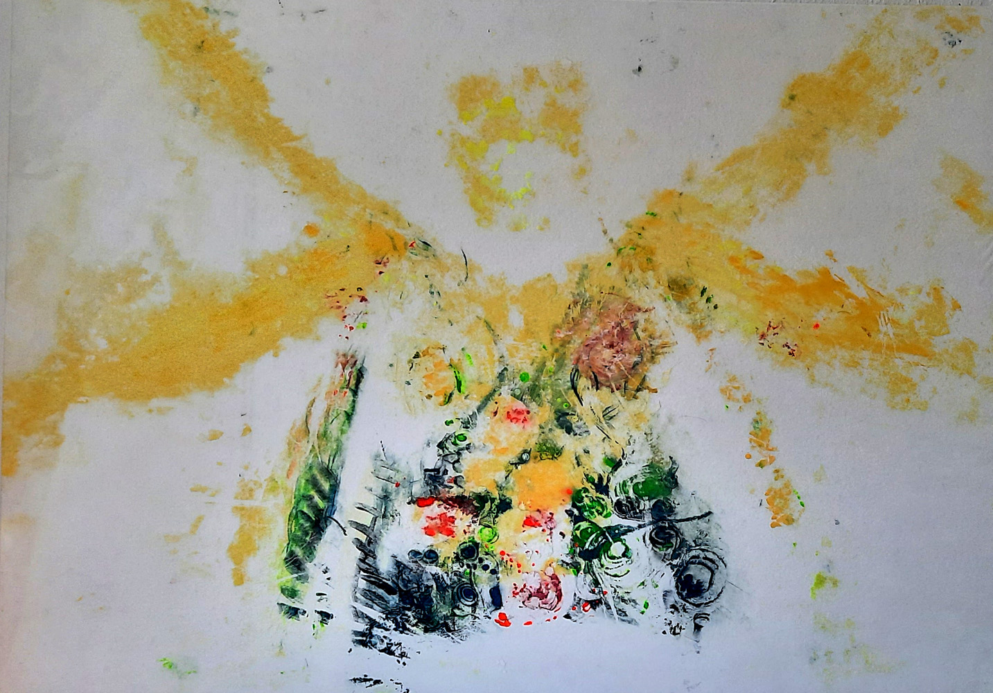 In ihrer Symmetrie und Aufrichtung sind bisher von Körpervorderseiten immer hochformatige Bilder entstanden. In diesem Falle hier war die Vorderseite aber als Querformat gewünscht. Da wir als Themen Abgrenzung und Schutz in das Massage-Painting mit hineinnahmen, kam mir zu Beginn der Session ein Geistesblitz zu Hilfe. Ich ließ die Kundin mit der ersten Farbschicht (gelb) die Arme ausbreiten. Ich nahm bereits davon schon einen Abdruck und setzte die Körpermalerei wie gewohnt fort. Den gleichen Vliesstoff nutze ich am Schluss noch einmal. Und schon war es quer, das Format. Ausreichend Platz für schutzgebende Flügel war entstanden. Während einer intensiven Festival-Yogastunde gab es eine Inspiration vom Lehrer zu unseren Flügeln. Die rechte Seite kann als unser „menschlicher Flügel“ angesehen werden. Die linke Seite als „göttlicher Flügel“. Wie toll, dass in diesem Bild hier tatsächlich auch der rechte Arm sichtbar geworden ist. Schutz und Abgrenzung. Zum einen liegt es schon bei uns verantwortungsvoll damit umzugehen. Aber wir sind durchaus auch unterstützt von unsichtbaren Kräften. Kannst Du das auch bestätigen?
